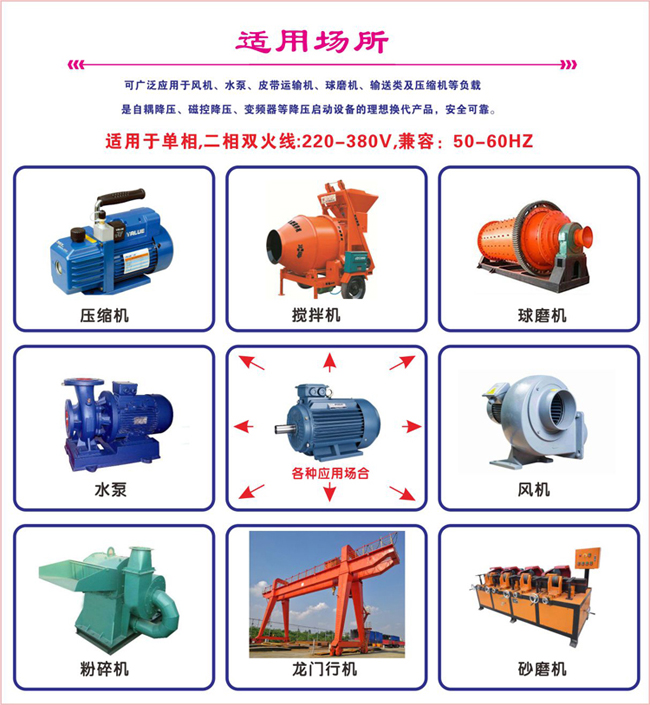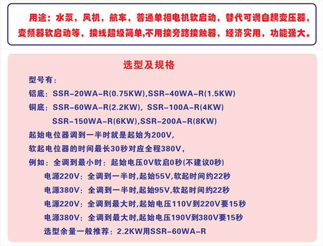用途:水泵,風機,航車,自耦變壓器等及普通單相電機軟啟動,替代可調自耦變壓器,變頻器軟啟動等,接線簡單, 不用接旁路接觸器,經濟實用,填補同類產品空白。